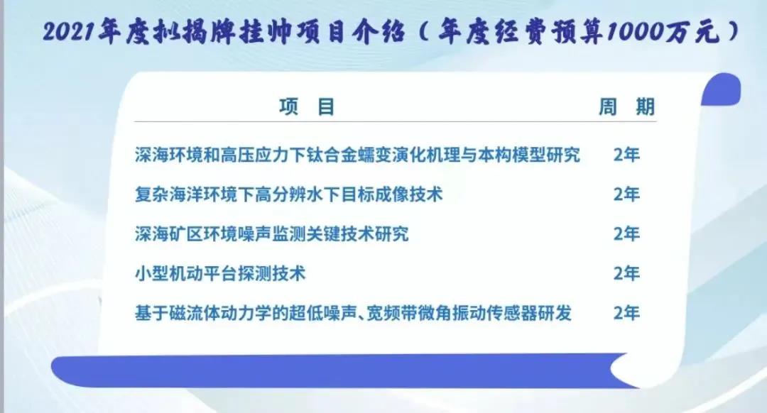 本次5個揭榜掛帥項目分別為:深海環境和高壓應力下鈦合金蠕變演化機理與本構模型研究、復雜海洋環境下高分辨水下目標成像技術、深海礦區環境噪聲監測關鍵技術研究、小型機動平臺探測技術、基于磁流體動力學的超低噪聲、寬頻帶微角振動傳感器研發。