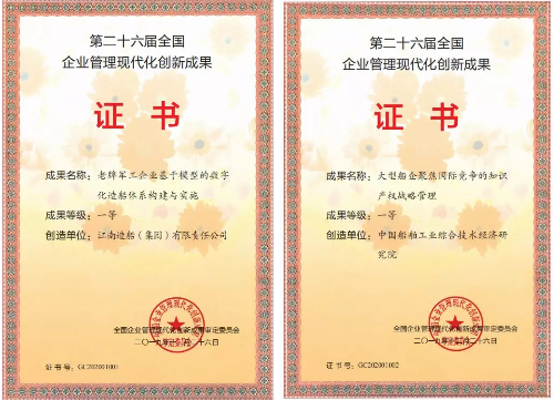 所屬江南造船(集團)有限責任公司申報的《老牌軍工企業(yè)基于模型定義的數(shù)字造船新模式構(gòu)建與實施》和中國船舶工業(yè)綜合技術(shù)經(jīng)濟研究院申報的《大型船企聚焦國際競爭的知識產(chǎn)權(quán)戰(zhàn)略管理》分獲國家級一等獎。本屆僅有30項一等獎,另有4項成果榮獲國家級二等獎,獲獎成果數(shù)量創(chuàng)船舶行業(yè)歷年最好成績。
