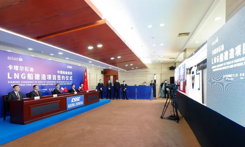 ????2019年4月22日,卡塔爾石油委托其子公司卡塔爾天然氣公司就“百艘LNG船計劃”進行招標。中國船舶集團高度重視、精心準備、積極溝通,組織旗下滬東中華聯合中國船舶工業貿易有限公司(CSTC)全力推進各項競標工作。經過一年的不懈努力和先后四輪談判,中國船舶集團最終在激烈的國際競爭中勝出,為卡塔爾石油建造下一代LNG船,彰顯了中國船舶集團在高端海洋裝備領域的強大實力。此次簽約也將為中國船舶集團完成全年目標任務奠定堅實基礎。