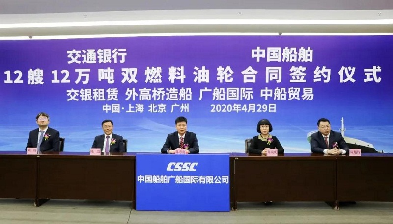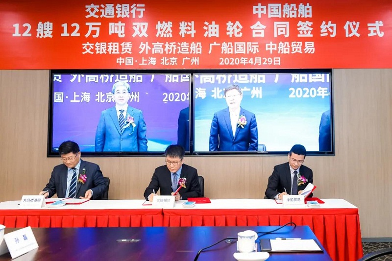 ????4月29日,中國(guó)船舶集團(tuán)有限公司旗下中國(guó)船舶工業(yè)貿(mào)易有限公司、上海外高橋造船有限公司、廣船國(guó)際有限公司與交通銀行股份有限公司旗下交銀金融租賃有限責(zé)任公司在北京、上海、廣州三地以“云簽約”方式簽署12艘12萬(wàn)噸雙燃料油船建造合同,合同總金額約46億元人民幣,這是中國(guó)船舶集團(tuán)旗下單位近期承接的又一單筆大額訂單。中國(guó)船舶集團(tuán)黨組書(shū)記、董事長(zhǎng)雷凡培,交通銀行黨委書(shū)記、董事長(zhǎng)任德奇,中國(guó)船舶集團(tuán)黨組成員、副總經(jīng)理孫偉,交通銀行黨委委員、副行長(zhǎng)呂家進(jìn)出席簽約儀式。