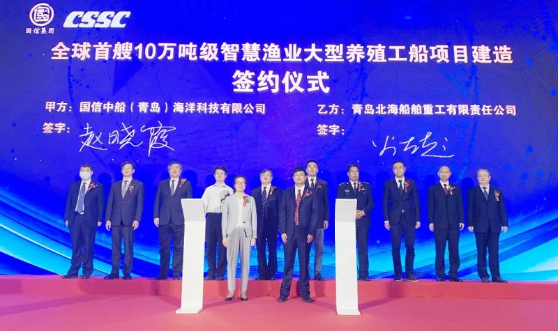 ????6月3日,中國(guó)船舶集團(tuán)有限公司旗下武船集團(tuán)青島北海船舶重工有限責(zé)任公司與國(guó)信中船(青島)海洋科技有限公司在青島西海新區(qū)正式簽署全球首艘10萬噸級(jí)智慧漁業(yè)大型養(yǎng)殖工船的建造合同。本次簽約標(biāo)志著養(yǎng)殖工船項(xiàng)目正式進(jìn)入實(shí)質(zhì)性建造階段,該船將于2022年3月交付。中國(guó)船舶集團(tuán)黨組成員、副總經(jīng)理孫偉,青島市副市長(zhǎng)耿濤等領(lǐng)導(dǎo)和嘉賓出席簽約儀式。