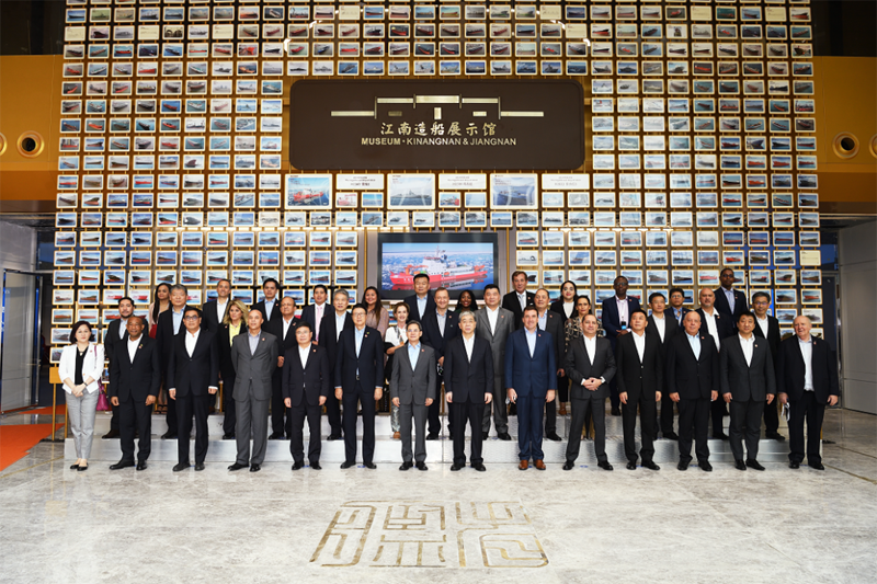 使節代表團先后參觀了中國船舶集團旗下滬東中華、江南造船,聽取了兩家企業重點產品、經營生產發展的總體介紹,并赴船塢、碼頭實地了解了在建的目前全球最大雙燃料23000TEU集裝箱船以及其他高技術、高附加值船舶建造情況。