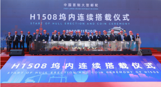 大型郵輪工程是中國船舶集團貫徹習近平總書記重要指示精神、落實國家戰(zhàn)略、滿足人民美好生活需要的重大舉措,也是中國船舶集團強化科技創(chuàng)新、促進轉型升級、推動高質量發(fā)展的一號工程。2018年11月6日,中國船舶集團與美國嘉年華集團、意大利芬坎蒂尼集團在首屆中國國際進口博覽會上正式簽訂2+4艘13.5萬總噸Vista級大型郵輪建造合同,并舉行了中國船舶集團大型郵輪項目工程正式啟動儀式。這是我國首次簽訂真正意義上的大型郵輪建造合同,開啟了中國船舶工業(yè)建造大型郵輪的新時代。2019年10月18日,中國首制大型郵輪在外高橋造船正式開工點火進行鋼板切割,全面進入實質性建造階段。一年多來,在中國船舶集團的堅強領導下,在中船郵輪科技發(fā)展有限公司、中船第九設計研究院工程有限公司、上海船舶工藝研究所等兄弟單位的大力支持下,外高橋造船經受住了新冠肺炎疫情的洗禮和考驗,克服了物資采購、薄板車間流水線建設滯后等一系列困難,一步一個腳印,如期實現(xiàn)了塢內連續(xù)搭載總裝的里程碑節(jié)點。