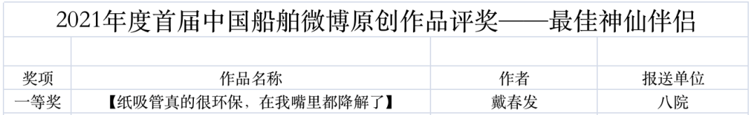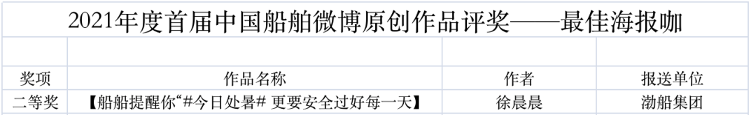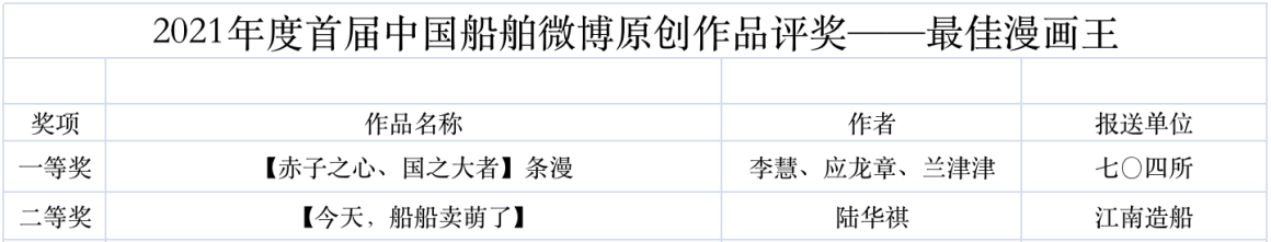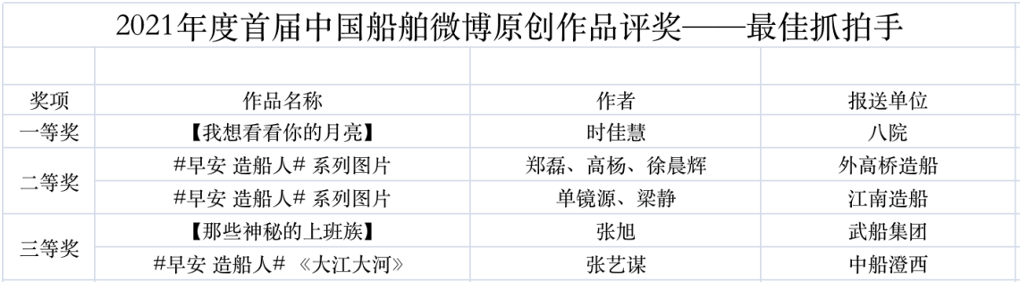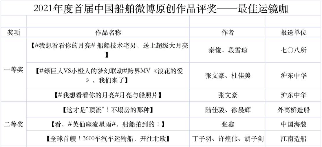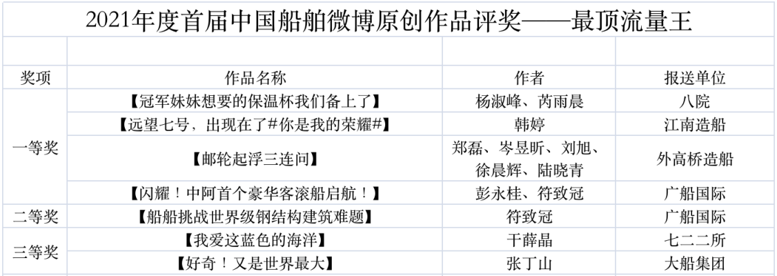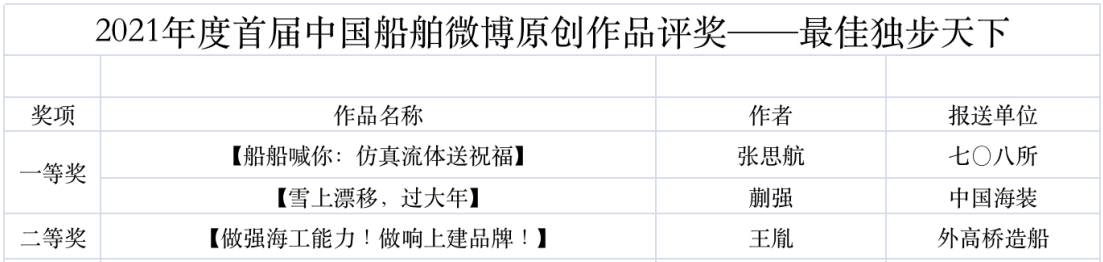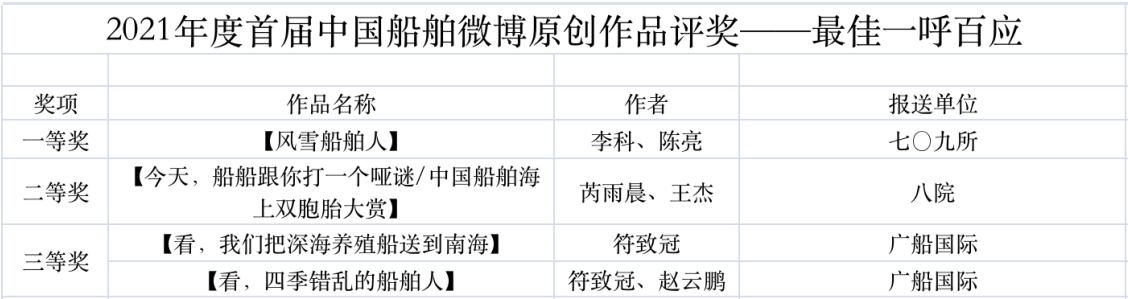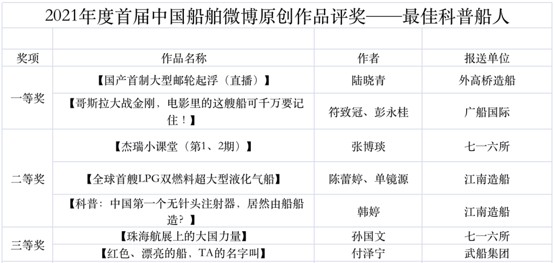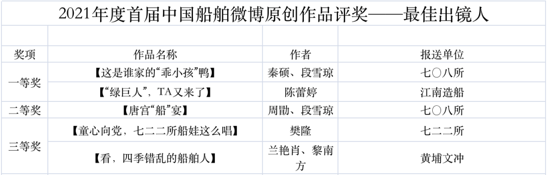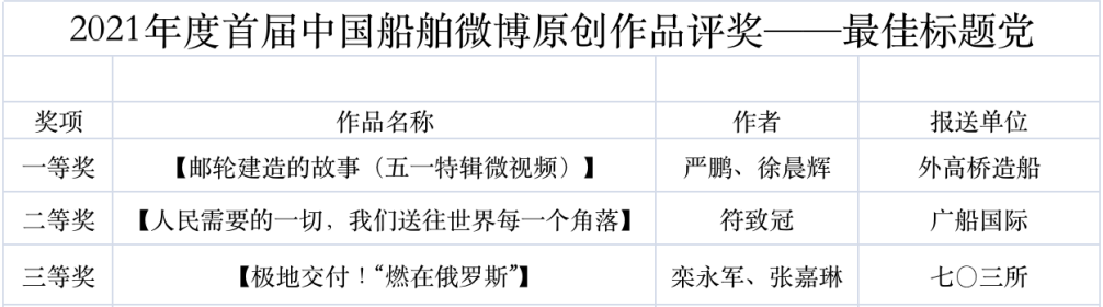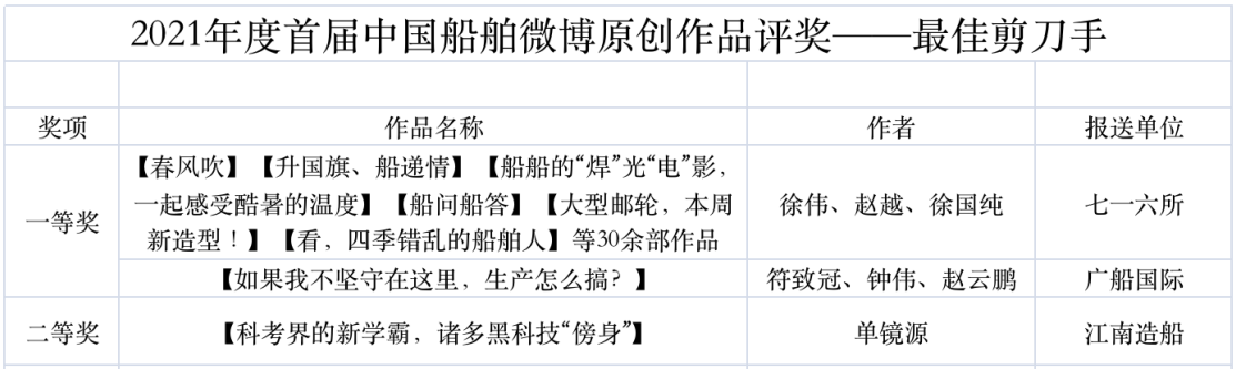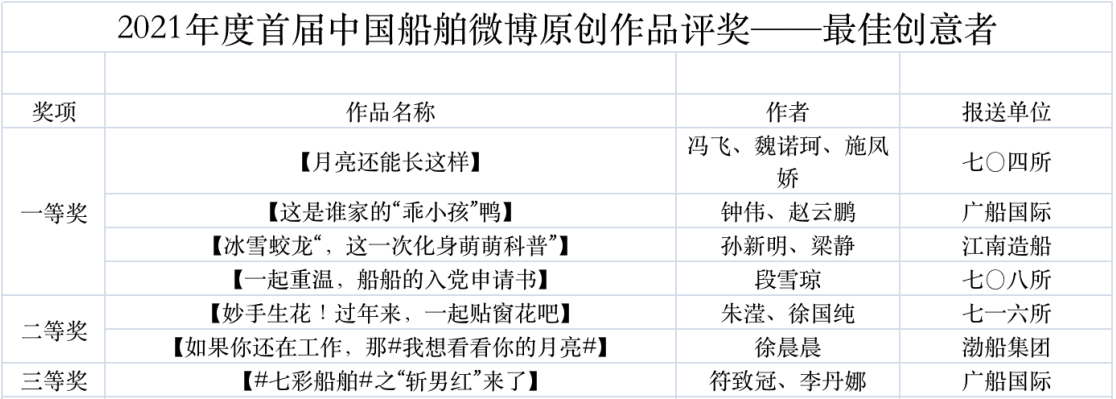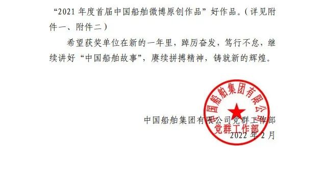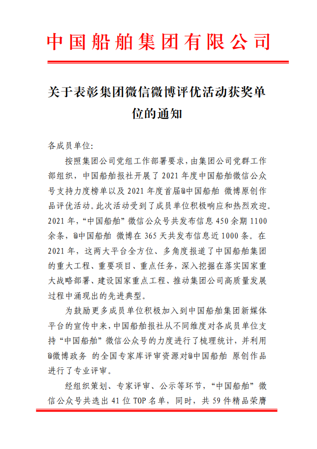 為鼓勵更多成員單位積極加入到中國船舶集團新媒體平臺的宣傳中來,在集團公司黨群工作部的指導下,中國船舶報社從不同維度,對2021年度各單位支持“中國船舶”微信的力度進行了梳理統計,并利用微博政務的全國專家庫評審資源,對2021年度“中國船舶”微博原創作品進行了專業評審,評選結果公布如下: