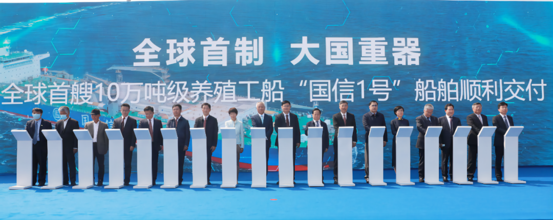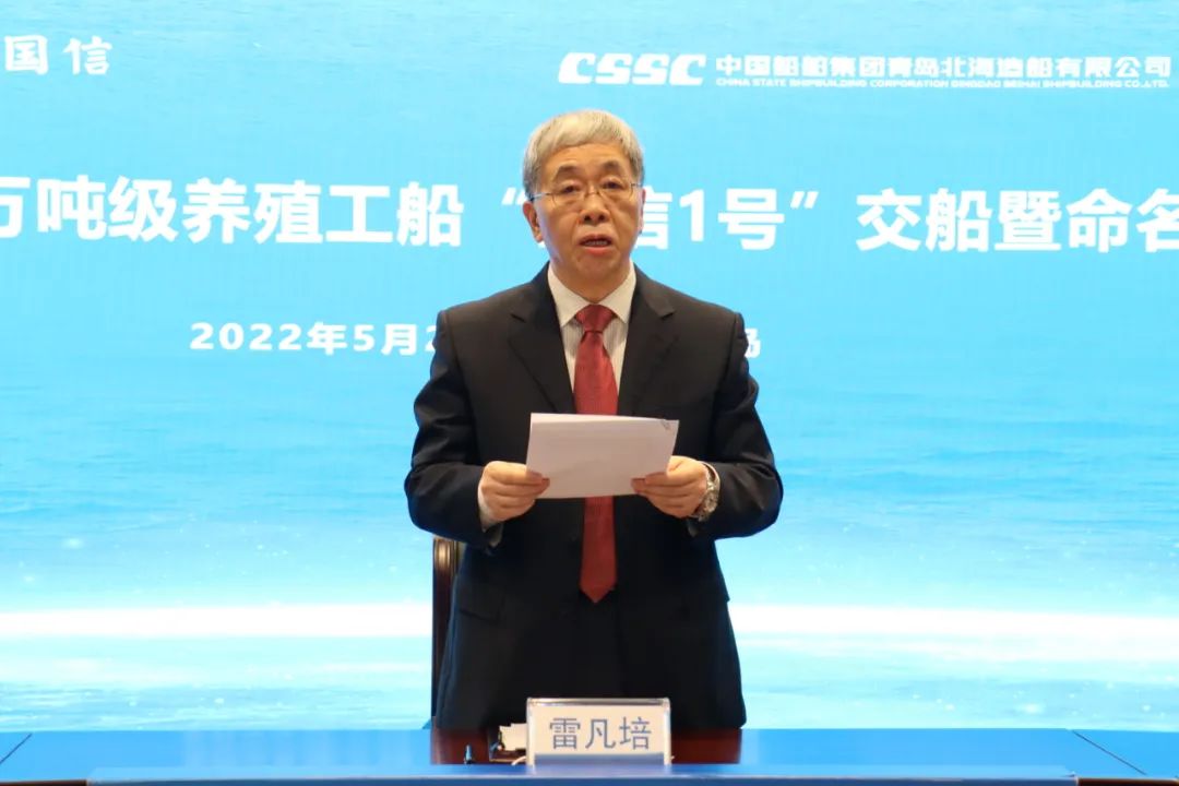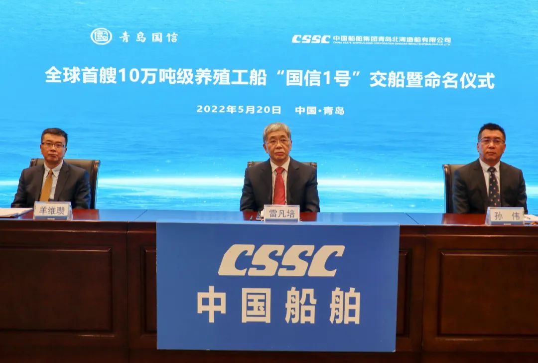 5月20日,中國船舶集團旗下青島北海造船有限公司為青島國信發展(集團)有限責任公司建造的全球首艘10萬噸級智慧漁業大型養殖工船“國信1號”交船命名儀式在青島舉行。中國船舶集團黨組書記、董事長雷凡培,黨組成員、副總經理孫偉通過視頻出席儀式,山東省人民政府黨組成員、副省長凌文,青島市委副書記、市長趙豪志,中國海洋大學黨委副書記、校長于志剛,中國工程院院士麥康森等領導和嘉賓出席儀式。青島市副市長趙燕為新船命名。