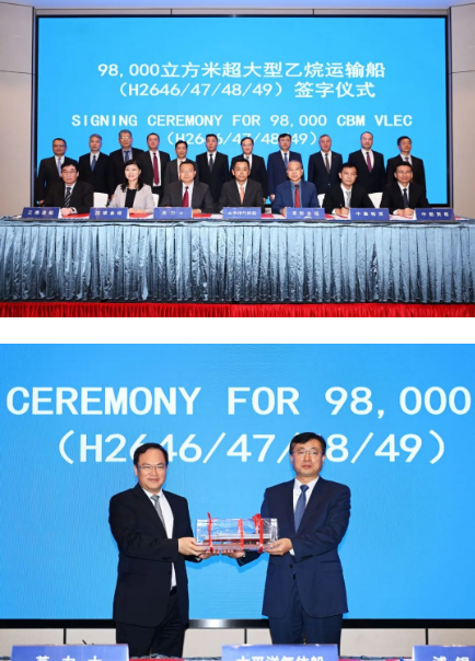11月2日,中國(guó)船舶集團(tuán)旗下江南造船(集團(tuán))有限責(zé)任公司承建的,山東海洋集團(tuán)下屬太平洋氣體船4艘超大型乙烷運(yùn)輸船項(xiàng)目簽約儀式在上海舉行。中國(guó)船舶集團(tuán)黨組副書記、總經(jīng)理?xiàng)罱鸪桑h組成員、副總經(jīng)理孫偉,山東海洋集團(tuán)黨委書記、董事長(zhǎng)姜國(guó)棟,黨委委員、副總經(jīng)理于冰出席儀式。