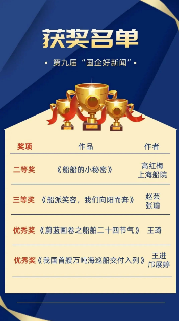 近日,第九屆“國(guó)企好新聞”獲獎(jiǎng)作品正式揭曉,中國(guó)船舶集團(tuán)斬獲4項(xiàng)大獎(jiǎng),涵蓋科普類、影音類、圖片類、文字類等多種體裁。其中,二等獎(jiǎng)1項(xiàng)、三等獎(jiǎng)1項(xiàng)、優(yōu)秀獎(jiǎng)2項(xiàng)。