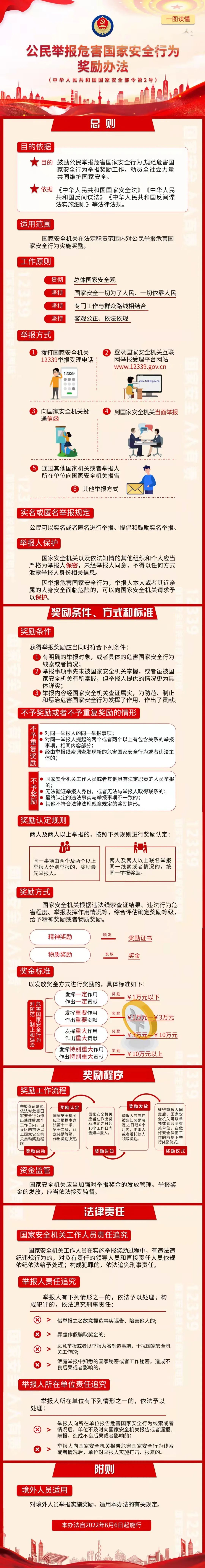 2022年6月6日,國(guó)家安全部公布部門(mén)規(guī)章《公民舉報(bào)危害國(guó)家安全行為獎(jiǎng)勵(lì)辦法》。國(guó)家安全一切為了人民,一切依靠人民,讓我們行動(dòng)起來(lái),共做國(guó)家安全的守護(hù)人!