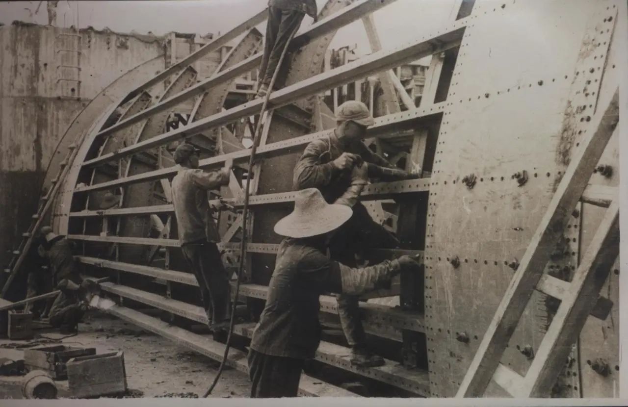 1934年武漢,上世紀30年代,武昌造船成立之初,工人們以手工作業“敲敲打打”形式開展修造船業務。修造的船只大多為100~300噸、鋼肋骨與木殼結構,僅有少量是鋼鉚接船體。建造的船只只能在長江上航行跑跑運輸。為了生存和救國,船廠還建造一些農用機械器具、槍支,以輔助民生、支援抗日。