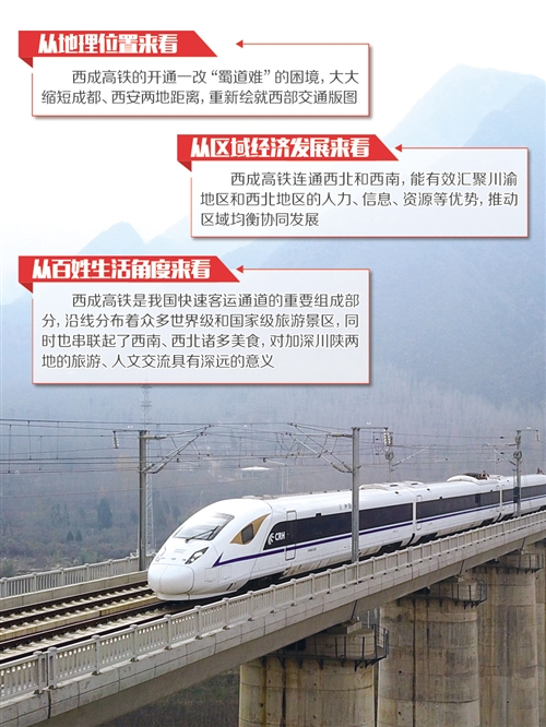 從地理位置來看,西成高鐵將一改“蜀道難”的困境,大大縮短成都、西安兩地距離,重新繪就西部交通版圖。從區(qū)域經濟發(fā)展來看,西成高鐵連通西北和西南,能有效匯聚川渝地區(qū)和西北地區(qū)的人力、信息、資源等優(yōu)勢,推動區(qū)域均衡協(xié)同發(fā)展。從百姓生活角度來看,西成高鐵是我國快速客運通道的重要組成部分,沿線分布著眾多世界級和國家級旅游景區(qū),對加深川陜兩地的旅游、人文交流具有深遠的意義。