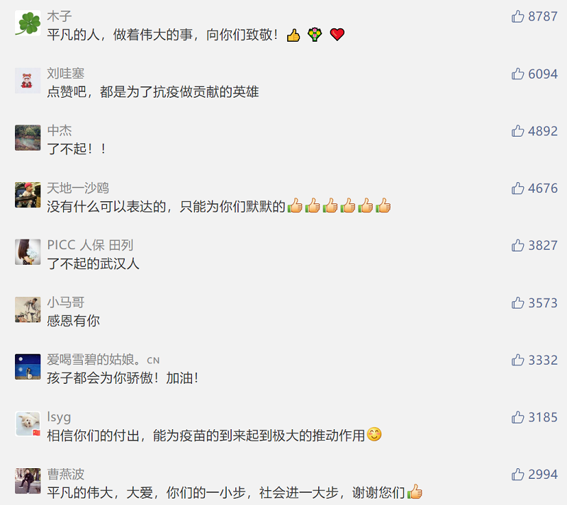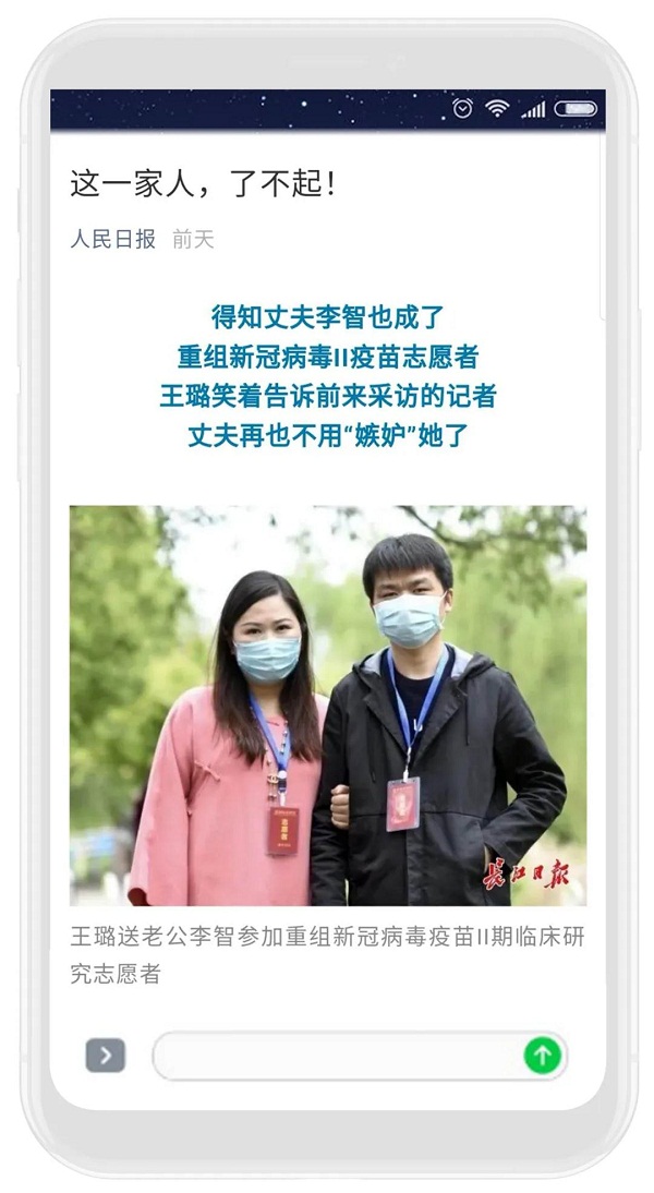 ????4月18日,人民日報微信公眾號推送了這樣一條消息,詳細(xì)介紹了一位土生土長的武漢人王璐及其家人自愿報名接種新冠疫苗的事跡,消息收獲了10萬+的閱讀量與3.2萬的“在看” ,還有動輒幾千的留言點贊!這位女主角王璐來自中國船舶集團七一七所,不同于第一批結(jié)束醫(yī)學(xué)觀察的志愿者,王璐所在組的年齡在20歲到50歲,是最早一批高劑量的接種者。