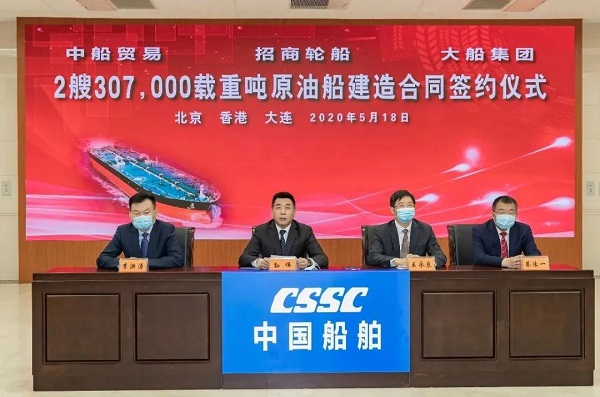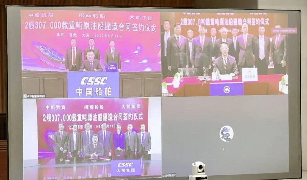 ????5月18日,中國船舶集團旗下大船集團、中船貿易與招商局集團旗下招商輪船在北京、大連、香港三地以“云簽約”方式簽署2艘30.7萬載重噸原油船建造合同。中國船舶集團副總經(jīng)理孫偉、招商局集團副總經(jīng)理王宏、招商輪船董事長謝春林出席簽約儀式,中船貿易董事長李洪濤、大船集團總經(jīng)理楊志忠、招商輪船總經(jīng)理王永新代表各方在建造合同上簽字。