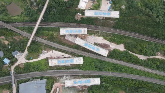 此次轉(zhuǎn)體的五段橋梁梁體為重慶新建快速路二橫線物流園區(qū)至禮白立交工程跨渭井、蔡歌聯(lián)絡(luò)線鐵路主線橋。