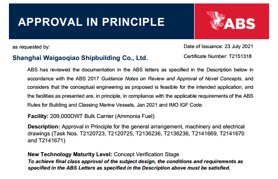 日前,中國船舶集團旗下外高橋造船自主研發設計的21萬噸氨燃料動力散貨船獲得美國船級社(ABS)頒發的原則性認可證書(AIP)。作為具有潛力的零碳燃料,氨燃料能滿足更加嚴格的溫室氣體排放要求,是未來脫碳航運業中最有希望的替代燃料之一。氨燃料動力船型的推出,為航運業提供一種零碳運輸的環保新方案。