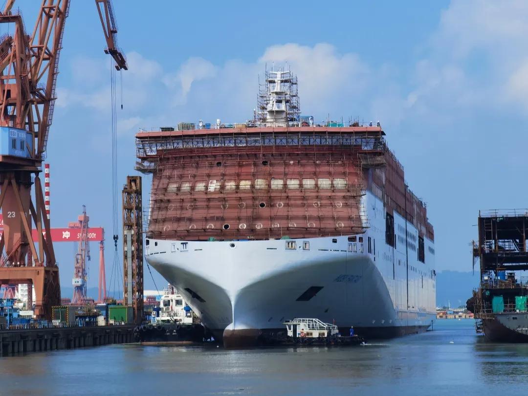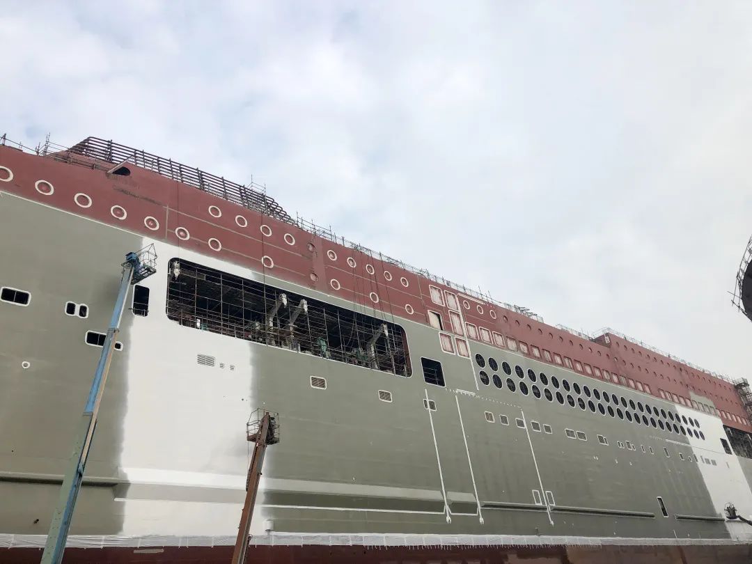 該船實現(xiàn)了出塢前上建亮燈。電纜拉放完成率87.8%,作為全球最大的豪華客滾船,該船全船電纜長度達(dá)到了946公里(相當(dāng)于從廣州到重慶);出塢前已完成了830公里電纜的拉放工作。涂裝完整性實現(xiàn)突破,該船出塢時上層建筑上方仍有部分區(qū)域未完成涂裝? 這是因為該船垂直高度已接近40米,超過了船塢高空車的最大極限。