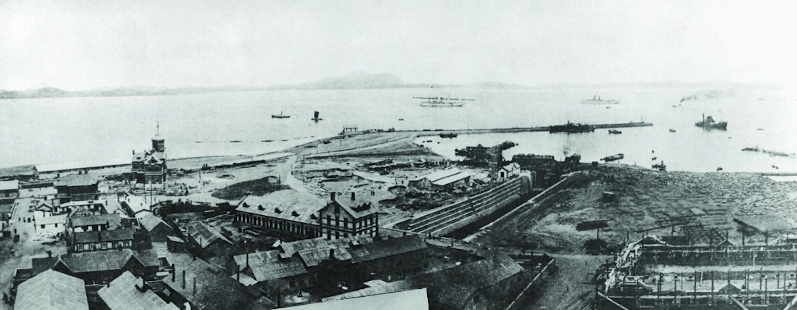 修船南塢始建于1899年,1902年底初建完工,長116米、寬13米、深7.6米,采用兩開式扉門,并配備電動排水泵。