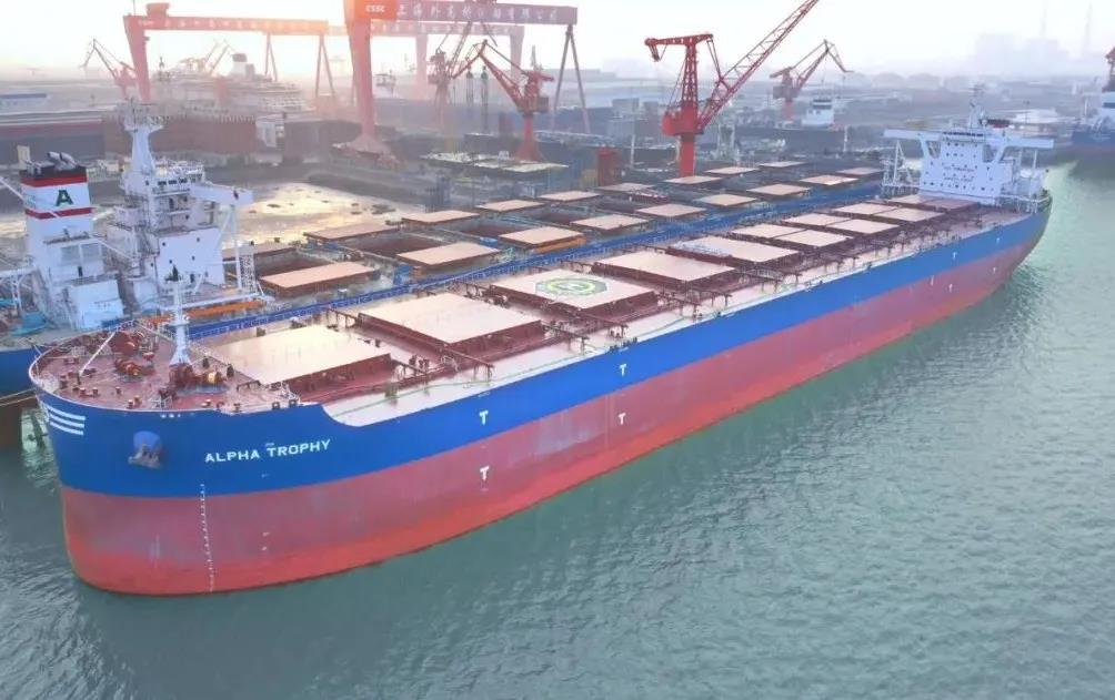 1月1日上午,中國船舶集團旗下外高橋造船聯合中船貿易建造的21萬噸紐卡斯爾型散貨船“ALPHA TROPHY”號簽字交船,這是中國船舶企業新的一年完工交付的第一艘船,開啟中國船舶制造業2022年昂揚奮進新征程。