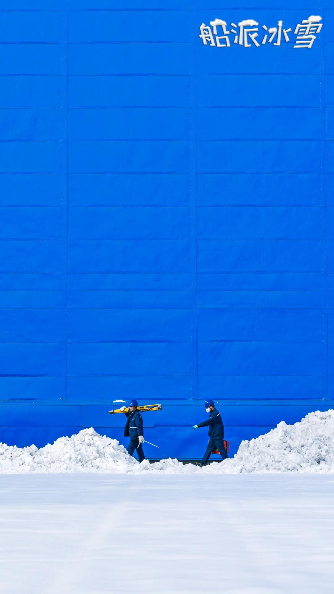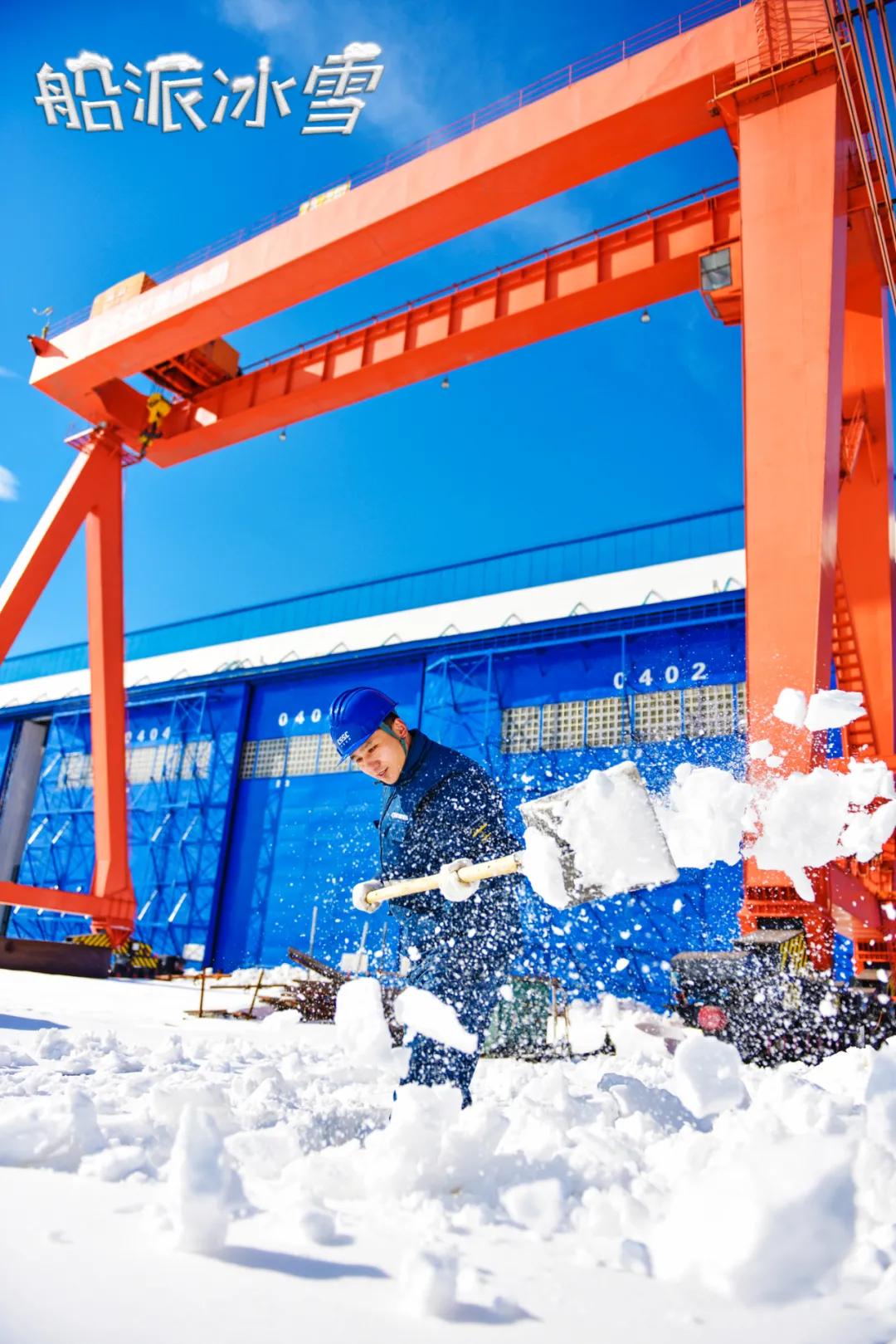 過(guò)膝的大雪掩埋了吊車(chē)的軌道,渤船小伙抄起“家伙”,為吊車(chē)開(kāi)道,胳膊掄圓,雪花紛飛,別說(shuō)這畫(huà)面還真有點(diǎn)浪漫了。