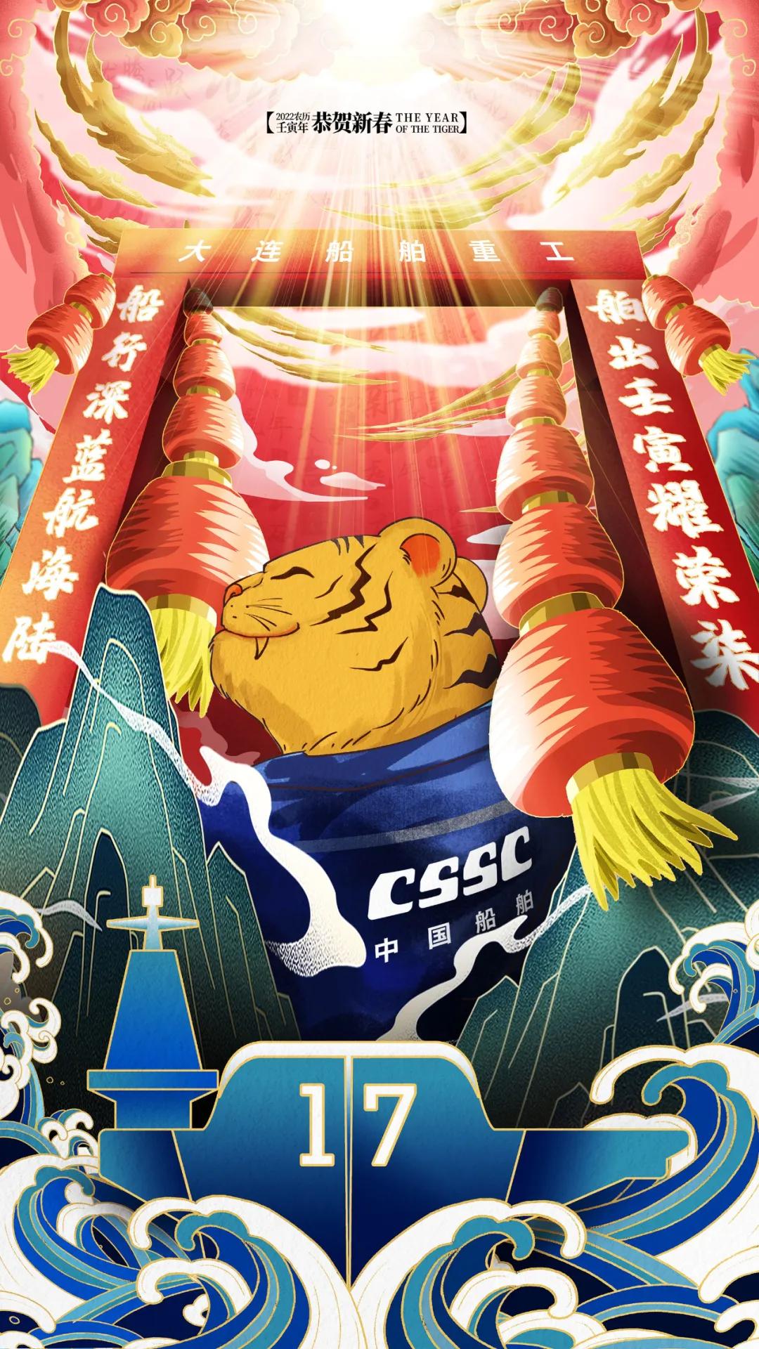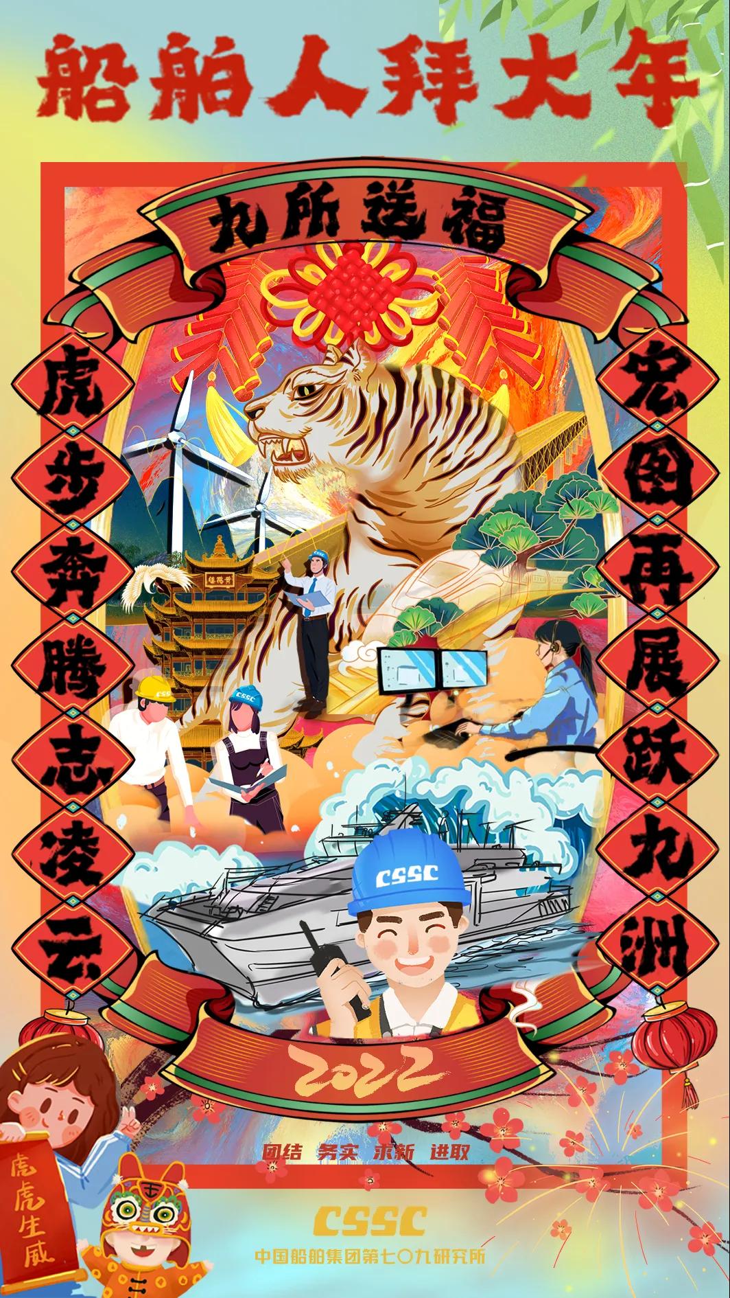 海報采用國潮畫風(fēng),中間部分“江小南”穿著新衣舉著虎頭,寓意新的一年中國船舶人虎虎生威,上面部分以重要產(chǎn)品和廠區(qū)設(shè)備為主,詮釋江南造船建造國之重器的初心和使命,同時輔以鞭炮、煙花、燈籠等新年元素,使海報充滿喜慶祥和的新年氛圍。