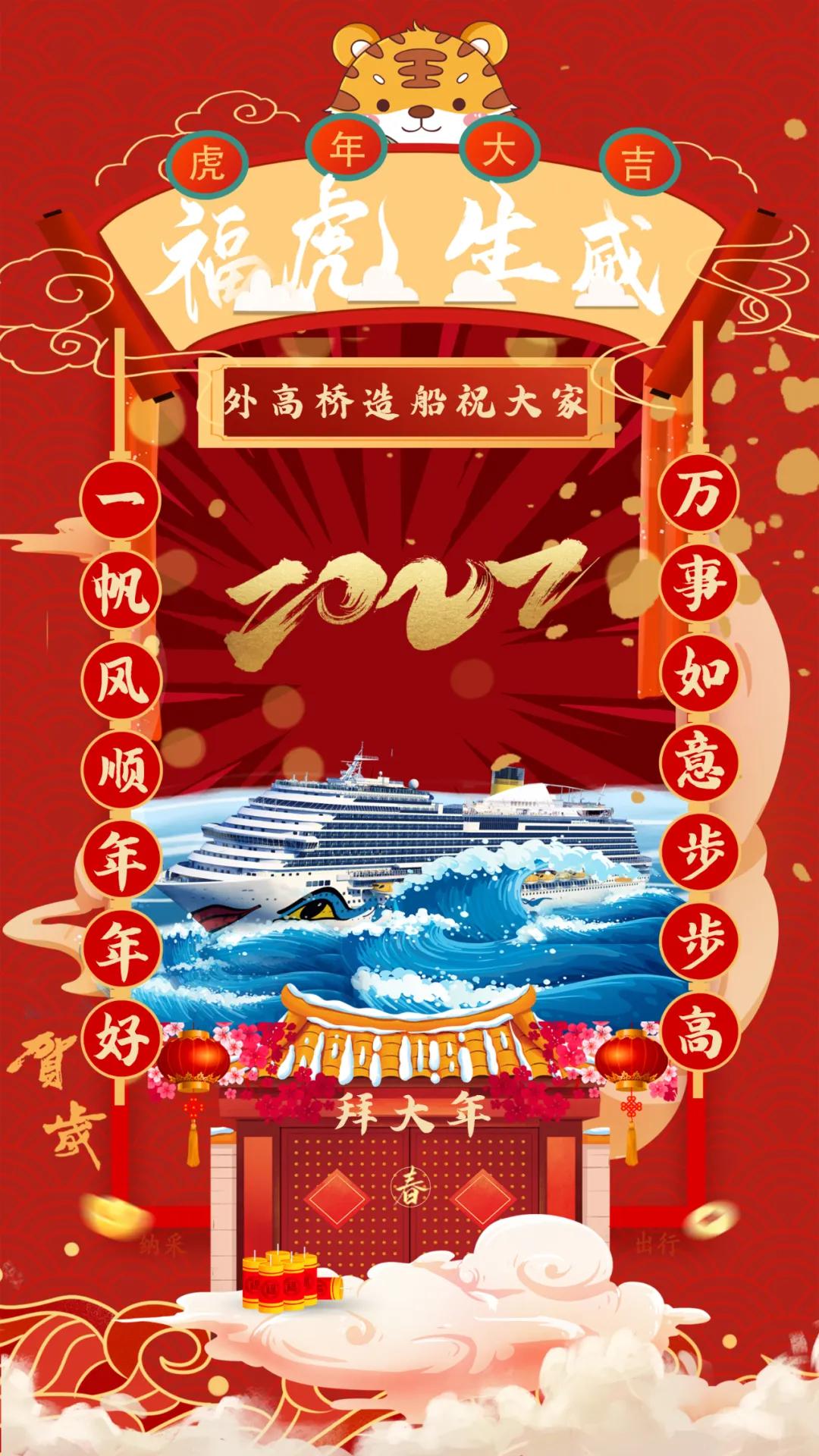 以門為前景,郵輪在海上乘風(fēng)破浪,寓意中國首制大型郵輪建造能取得開門紅!以紅色為背景,表達新年喜慶的節(jié)日氛圍,也祝福祖國郵輪產(chǎn)業(yè)的發(fā)展紅紅火火,蒸蒸日上!