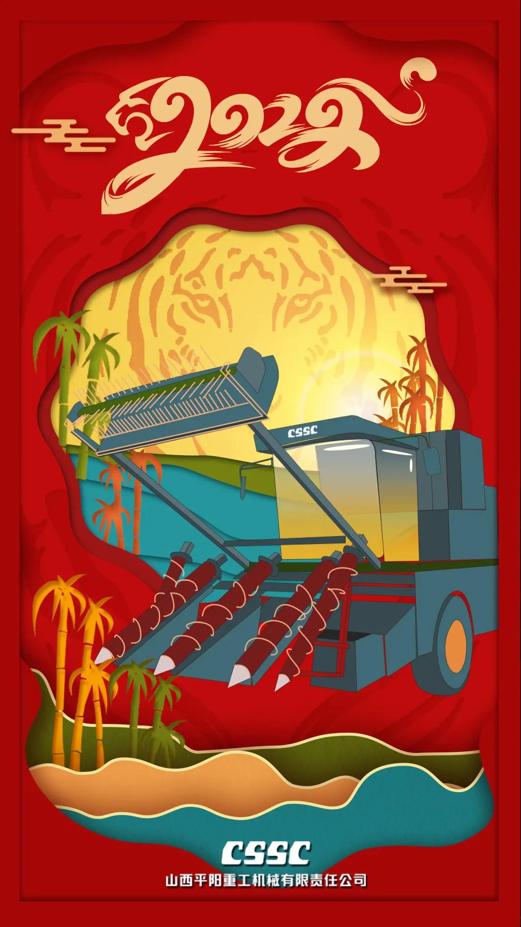 海報采用剪紙風(fēng)格,層層遞進的縱深感傳遞著平陽人不斷探索創(chuàng)新的拼搏精神;海報主體為平陽重工新產(chǎn)品——甘蔗收獲機,展示著平陽風(fēng)采;海報以“虎紋”為背景,以紅色為主色調(diào),烘托出虎年的喜慶氛圍。