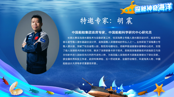3月22日,由山東省大中小學海洋文化教育研究指導中心、中國海洋大學等單位聯合主辦的“探秘神奇海洋”云端科普活動的重點板塊之一——“深海探索”直播正式開播。中國船舶集團首席專家、中國船舶集團七〇二所研究員胡震在直播間為廣大觀眾答疑解惑,近6萬名觀眾觀看直播并提出了各類關于深海的問題。