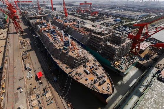 近日,在中船長(zhǎng)興造船基地中國(guó)船舶集團(tuán)旗下滬東中華2號(hào)船塢,首次呈現(xiàn)了4艘174000立方米大型液化天然氣(LNG)運(yùn)輸船同塢建造,其中2艘同日出塢、2艘半船起浮的盛景。
