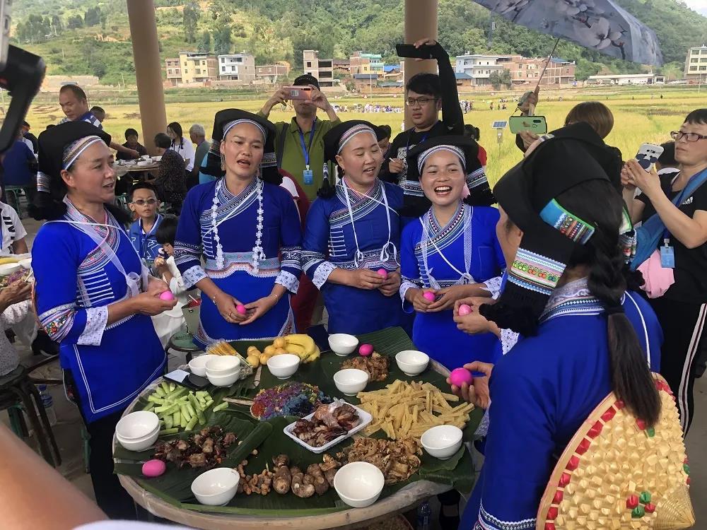 國(guó)家繁榮昌盛,人民生活幸福日子甜美。中午時(shí)分,現(xiàn)場(chǎng)壯鄉(xiāng)長(zhǎng)桌簸箕宴盛裝開(kāi)席。喜悅的群眾對(duì)造型精巧、美妙絕倫的桑秋花米飯及平寨特色美食贊不絕口。一個(gè)個(gè)簸箕盛放的不僅是原生態(tài)健康美味,更是丘北壯鄉(xiāng)沉淀千年的魅力文化象征。
