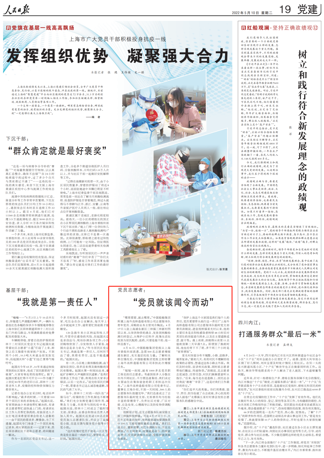 一個支部一座堡壘,一個黨員一面旗幟。哪里有急難險重任務,哪里就有黨員的擔當、就有組織的力量。充分發揮黨的組織優勢,凝聚強大合力,就“一定能夠打贏大上海保衛戰”。