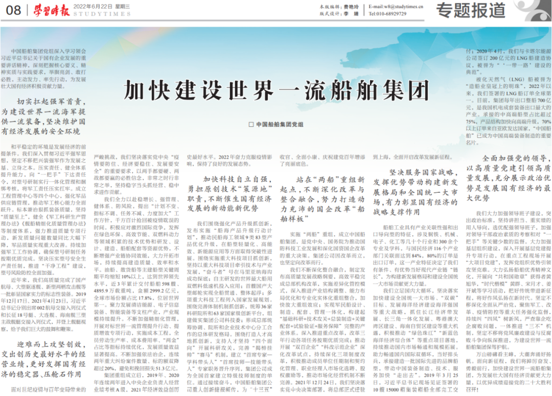 6月22日,《學(xué)習(xí)時(shí)報(bào)》發(fā)表中國船舶集團(tuán)黨組署名文章《加快建設(shè)世界一流船舶集團(tuán)》,萬山磅礴看主峰,大潮奔涌好揚(yáng)帆,面向新征程,中國船舶集團(tuán)將踔厲奮發(fā)、勇毅前行,為發(fā)展壯大國有經(jīng)濟(jì)貢獻(xiàn)更大力量,以優(yōu)異成績迎接黨的二十大勝利召開。