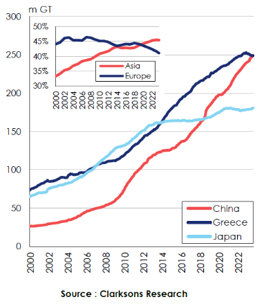截至8月12日,我國船東所持有的船隊(duì)規(guī)模已經(jīng)達(dá)到2.492億總噸,市場份額占比為15.9%(中國船東的船隊(duì)價(jià)值約為1800億美元),略高于希臘船東的2.490億總噸,市場份額占比15.8%(希臘船東的船隊(duì)價(jià)值約為1630億美元)。