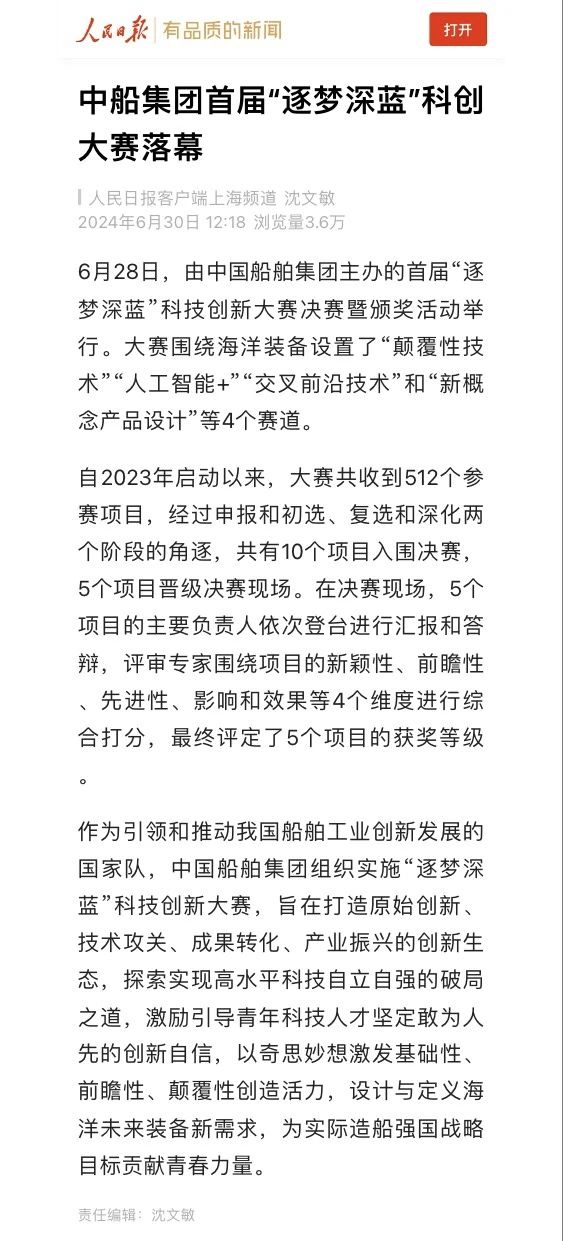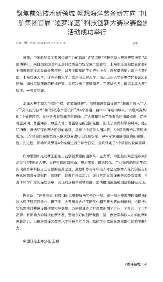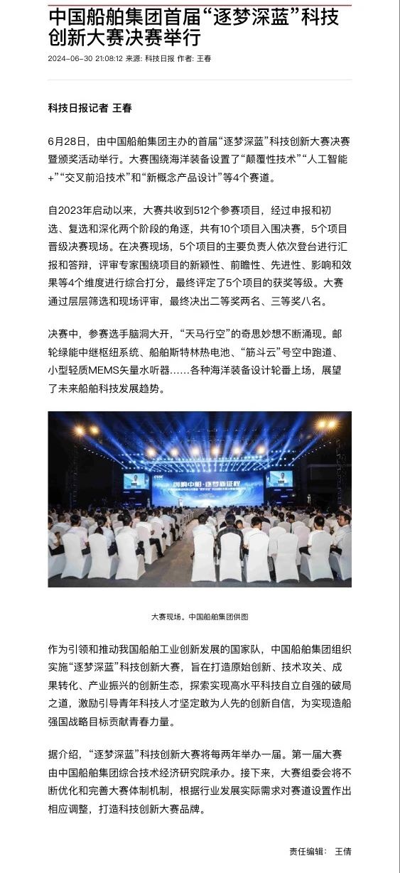 中國船舶集團有限公司主辦的首屆“逐夢深藍”科技創新大賽決賽暨頒獎活動引來各大媒體的關注,獲得高度評價。——>活動回顧