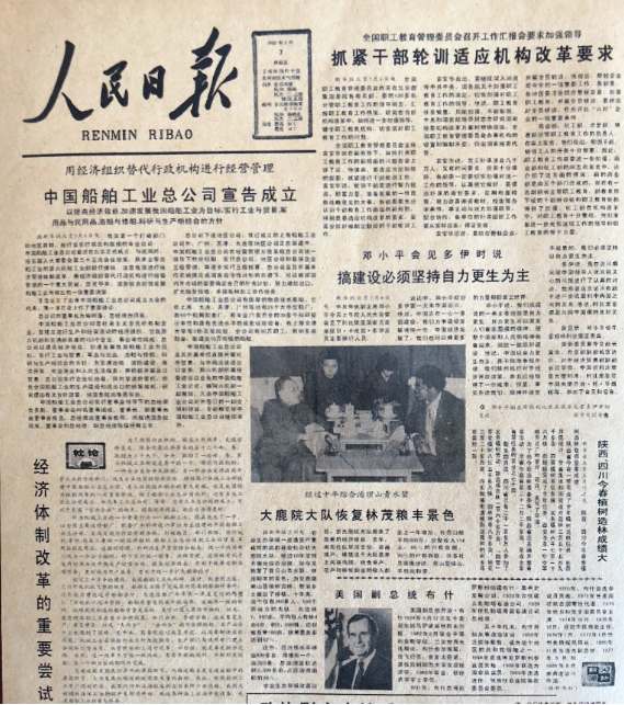 “改革開放是決定當(dāng)代中國命運(yùn)的關(guān)鍵一招。”1982年5月7日《人民日報》頭版刊載文章:“用經(jīng)濟(jì)組織替代行政機(jī)構(gòu)進(jìn)行經(jīng)營管理——中國船舶工業(yè)總公司宣布成立”,標(biāo)題下文又著重強(qiáng)調(diào)“以提高經(jīng)濟(jì)效益,加速我國船舶工業(yè)為目標(biāo),實行工業(yè)與貿(mào)易,軍用品與民用品,造船與修船,科研與生產(chǎn)相結(jié)合的方針”。頭版還發(fā)表了以“經(jīng)濟(jì)體制改革的重要嘗試”為標(biāo)題的“社論”。在這期《人民日報》的頭版還刊發(fā)了鄧小平同志接待外賓時的講話“搞建設(shè),必須堅持自力更生為主”。